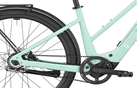 A Passage 10 Belt Slope se destaca pelo motor SX de 2 kg da Bosch e bateria fina de 400 Wh, oferecendo potência suficiente para subidas e autonomia para trajetos longos. O fator Q mais estreito do motor proporciona um estilo de pedalada natural. O garfo de suspensão de 75 mm garante conforto em pavimentos irregulares, enquanto o bagageiro traseiro permite carregar itens essenciais com facilidade. A transmissão por correia mantém a bicicleta limpa, sem necessidade de lubrificante e com mínima manutenção.